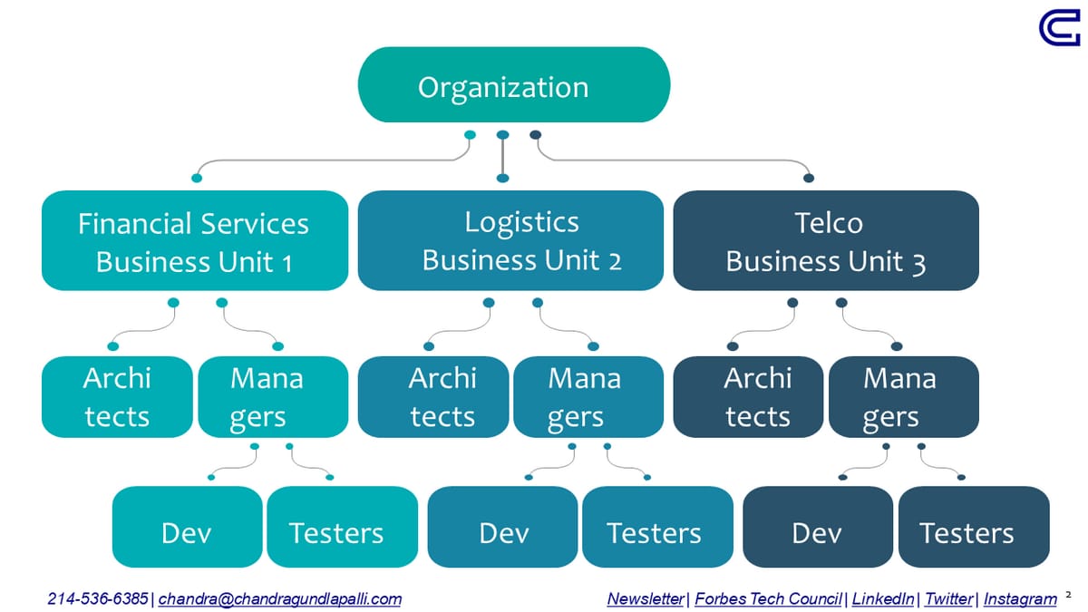 When I took on the responsibilities, my BU had a lot of silos and duplications (architects, developers, testers, etc.), something like this,